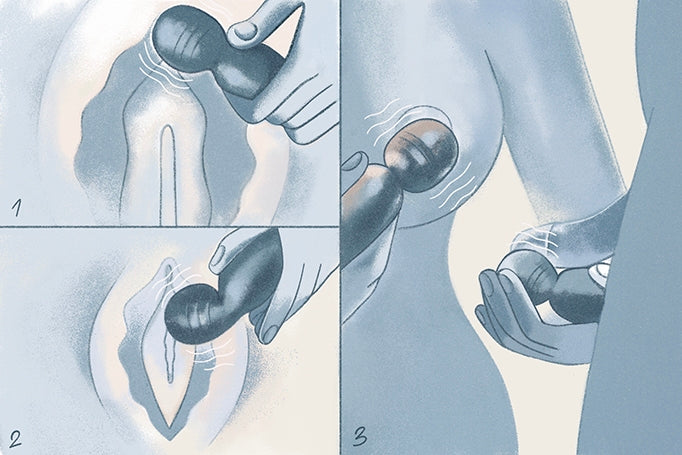 For a more diffused approach, use the rounded and flexible head to curve toward and contour your vulva. Move the vibrator up and down, or from side to side.